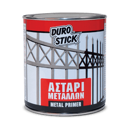 Powerful, white or gray anticorrosive metal primer. It is applied smoothly, has strong adhesion, great coverage, spreads perfectly, dries quickly and is easy to sand. When used as an anticorrosive substrate, it protects properly prepared metal surfaces, such as railings, doors and any kind of metal construction (*). Apply it in one coat on walls and ceilings saturated with nicotine and soot, after sweeping the surfaces thoroughly. Apply it also on surfaces with black spots due to moisture, as well as on whitewashed ceilings or surfaces coated with organic glue. Just a coat of METAL PRIMER of DUROSTICK is enough to block stains, blotches and yellow marks from surfaces and to properly prepare surfaces for any application of paint.