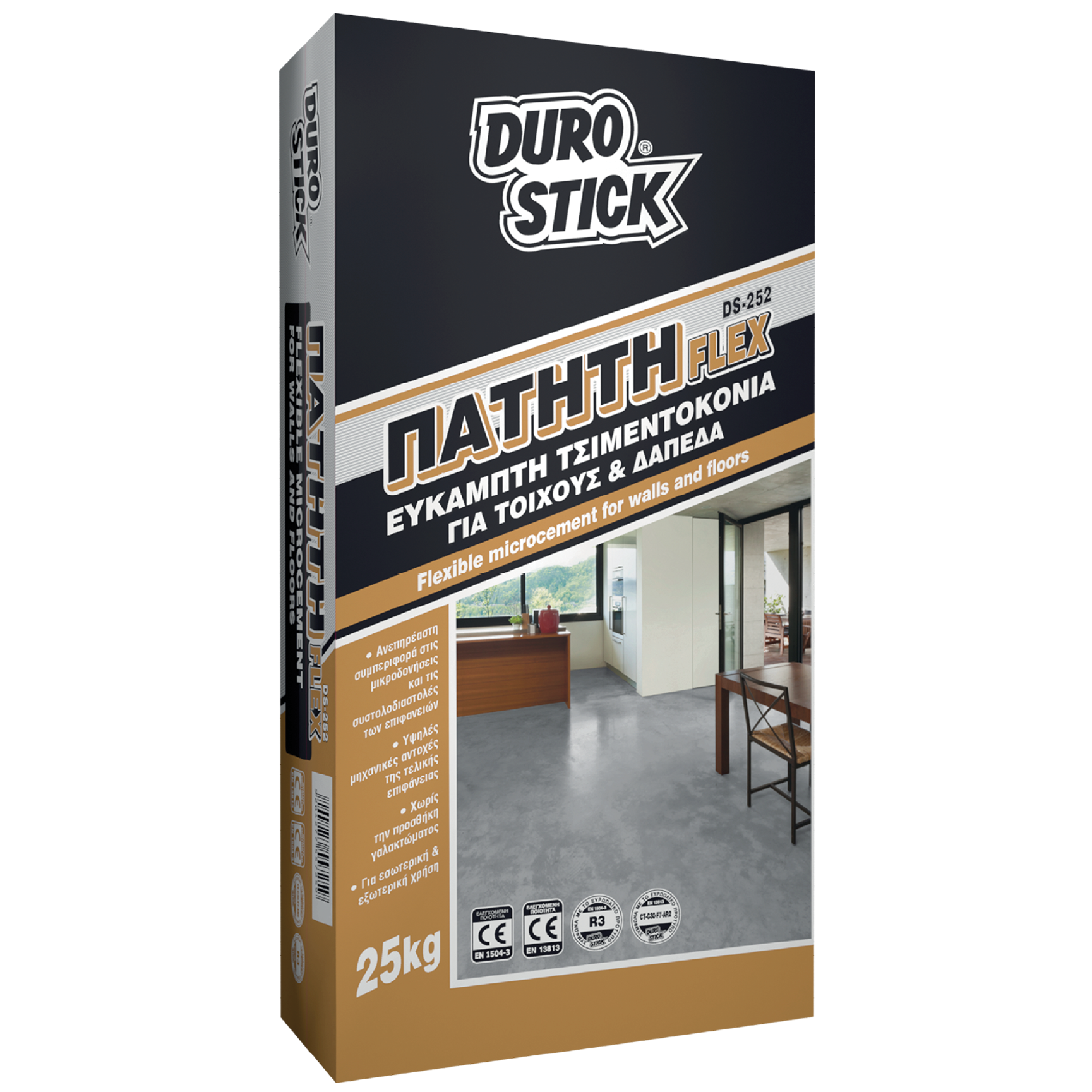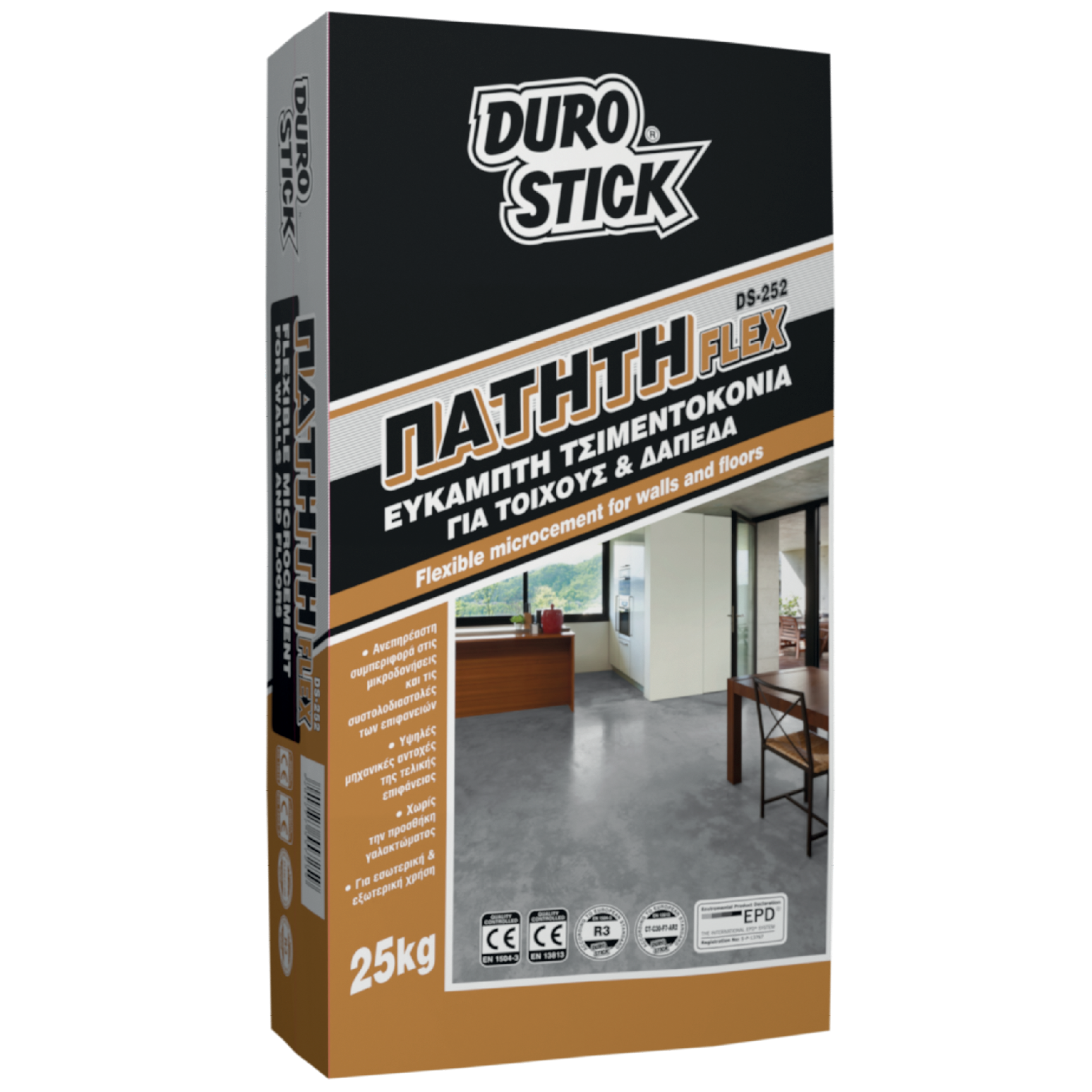 Έτοιμο, λευκό ή έγχρωμο τσιμεντοκονίαμα, κατάλληλο για εφαρμογή σε κάθετες και οριζόντιες επιφάνειες, σε εσωτερικούς και εξωτερικούς χώρους. Στην ινοπλισμένη σύνθεσή του, περιέχονται τσιμέντο υψηλών αντοχών, κατάλληλα διαβαθμισμένα χαλαζιακά αδρανή, ειδικά ενεργά πρόσθετα και ρητίνες κορυφαίας ποιότητας που του προσδίδουν ευκαμψία, άρρηκτη πρόσφυση με το υπόστρωμα, πολύ καλή εργασιμότητα και τελική επιφάνεια με υψηλές μηχανικές αντοχές. Ακολουθεί με επιτυχία τις συστολές και διαστολές των επιφανειών χωρίς να ρηγματώνει, μένει ανεπηρέαστο από μικροδονήσεις, ενώ αντέχει στις απότομες θερμοκρασιακές μεταβολές και τις αντίξοες συνθήκες του περιβάλλοντος. Η προηγμένη του σύνθεση δεν ‘απαιτεί’ προσθήκη - ενίσχυση με βελτιωτικά γαλακτώματα. Η DS-252 FLEX χρωματίζεται στη μάζα της με την προσθήκη υδατοδιαλυτών χρωστικών επικαλυμμένων με βινυλικές ρητίνες σε μορφή πούδρας DUROCOLOR POWDER-C 96 αποχρώσεων ή με επίπαση των χρωστικών στην επιφάνειά της. Μπορείτε να δημιουργήσετε τις δικές σας μοναδικές τεχνοτροπίες επάνω στην επιφάνεια της πατητής με τους τσιμεντοειδείς ΑΡΜΟΣΤΟΚΟΥΣ της DUROSTICK, στο σύνολο των 32 αποχρώσεών τους, καθώς και με το Δοσομετρικό Σύστημα Δημιουργίας Αποχρώσεων DUROCOLOR. Ποσότητες άνω των 250kg, για την κάλυψη περίπου 35m², μπορούν να παραδοθούν έτοιμες χρωματισμένες.