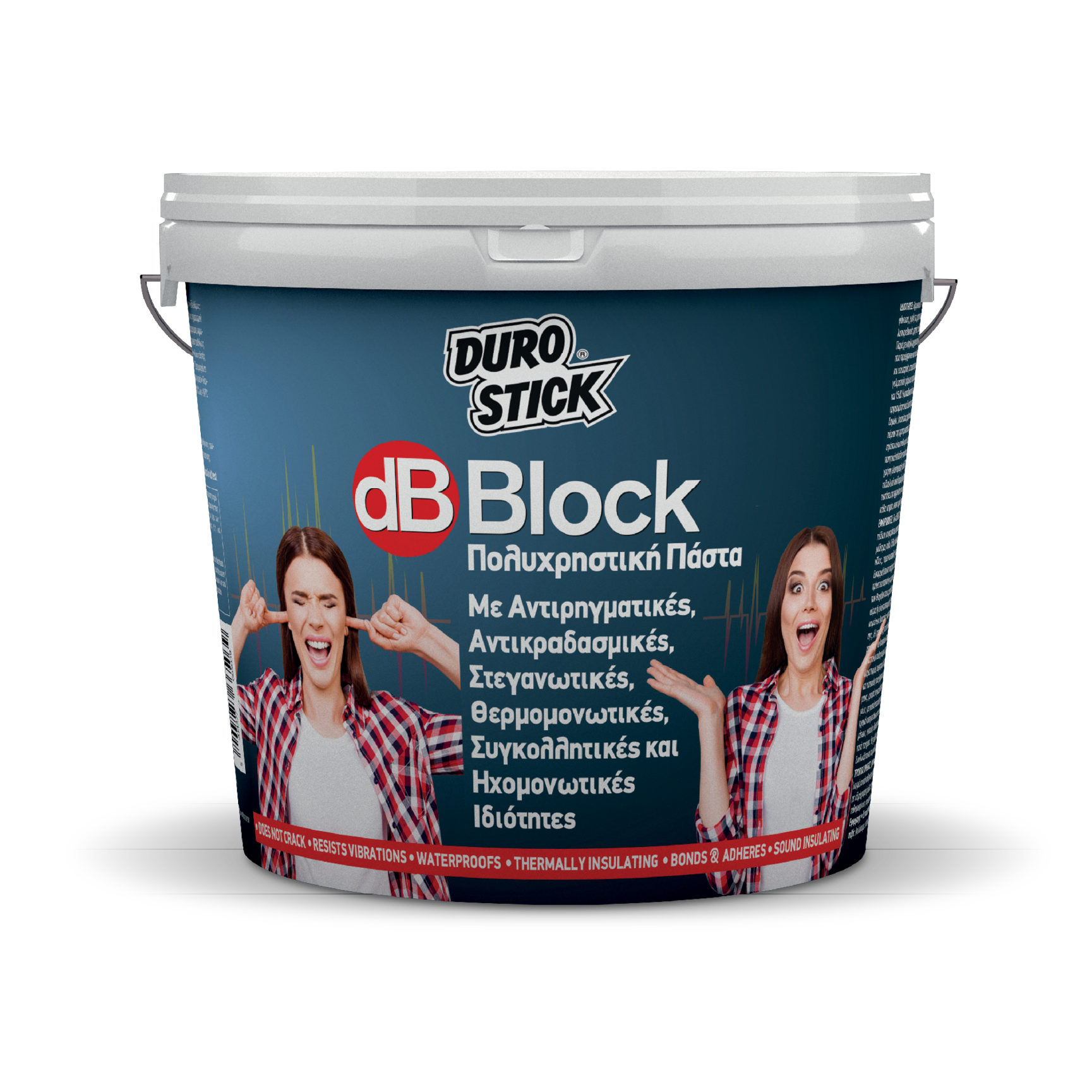 Καινοτόμο προϊόν με 6 μοναδικές ιδιότητες: Αντιρηγματικό, Αντικραδασμικό, Θερμομονωτικό, Ηχομονωτικό, Συγκολλητικό & Στεγανωτικό επίχρισμα. Σε μορφή πάστας, με υψηλή πρόσφυση σε κάθε τύπο επιφάνειας, χωρίς τη χρήση ασταριού. Η καινοτόμος σύνθεσή του, εμπεριέχει ακρυλικές και πολυουρεθανικές ρητίνες, καθώς και μείγμα καουτσούκ τύπου Buna-s. Παρέχει υψηλή ηχομονωτική ικανότητα απορρόφησης αερόφερτων και κτυπογενών θορύβων που προέρχονται από το εξωτερικό ή το εσωτερικό περιβάλλον, περιορίζοντας τη μετάδοση ενοχλητικών θορύβων από 50% έως και 70%. Η μοναδικότητά του, εστιάζεται στην παστώδη μορφή του, που διασφαλίζει εξαιρετική εργασιμότητα και δυνατότητα εφαρμογής ακόμη και στα πλέον δυσπρόσιτα σημεία των κτιριακών δομών, ενώ απαιτείται μικρή αναλογία βάρους και πάχους ως προς την καλυπτόμενη επιφάνεια. Εφαρμόζεται σε εσωτερικές και εξωτερικές, κάθετες ή οριζόντιες οικοδομικές επιφάνειες από σοβά ή μπετόν, συστήματα ξηράς δόμησης με γυψοσανίδες ή τσιμεντοσανίδες, ξύλινες επιφάνειες και ξυλοκατασκευές από κόντρα πλακέ θαλάσσης, OSB κ.ά., μεταλλικές επιφάνειες και σιδηροκατασκευές, λαμαρίνες, πάνελ αλουμινίου, πολυεστέρα, πλαστικό, σωλήνες PVC και πλήθος άλλων υλικών. Το dB BLOCK δημιουργήθηκε για να αντιμετωπίσει την ηχορύπανση, να προσφέρει θερμομόνωση, στεγανοποίηση, αντικραδασμικότητα και αντιρηγματική προστασία και να διασφαλίσει καλύτερες συνθήκες διαβίωσης στους κατοίκους κάθε κτιρίου, στον αρχικό σχεδιασμό του οποίου δεν είχαν προβλεφθεί τα ανωτέρω. Είναι ιδανικό για εφαρμογή σε υπό κατασκευή ή και υφιστάμενα κτίρια, αλλά και για ανακαινίσεις ξενοδοχείων, καταστημάτων, κέντρων διασκέδασης κ.ά. Πραγματοποιήθηκαν εργαστηριακές μετρήσεις ως προς τις ηχομονωτικές ιδιότητές του από το Εθνικό Ίδρυμα Ερευνών (Εργαστήριο Νανοεφαρμογής του Ινστιτούτου Θεωρητικής και Φυσικής Χημείας). Πιστοποιημένο από το Πανεπιστήμιο Αθηνών (Ομάδα Μελετών Κτιριακού Περιβάλλοντος, Τμήμα Φυσικής), ως προς τις θερμομονωτικές ιδιότητές του.